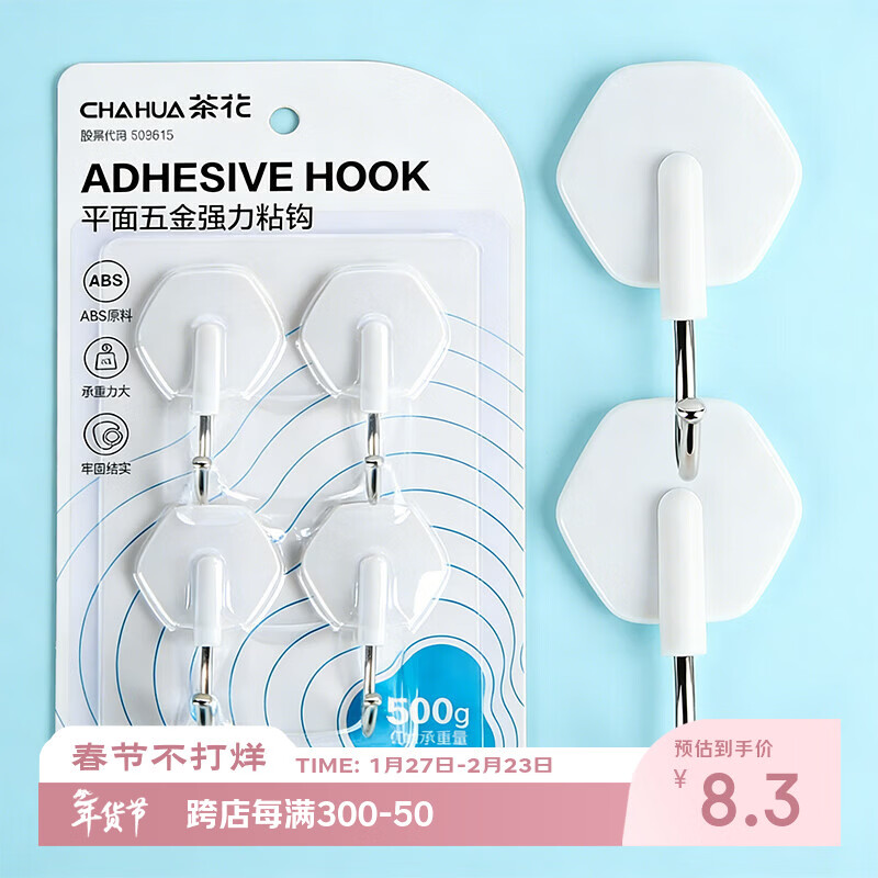 茶花挂钩贴 免钉浴室门后粘钩挂衣架 卫生间毛巾强力挂钩 4支装