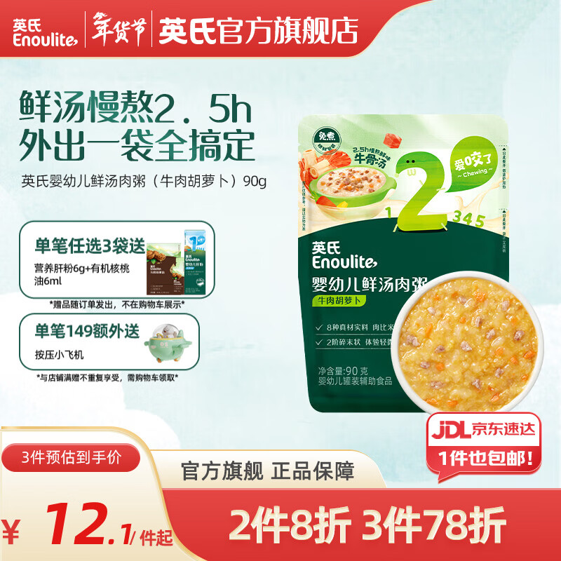 英氏婴幼儿谷物牛肉快冲粥营养即食婴儿冲泡粥宝宝辅食粥 鲜汤肉粥牛肉胡萝卜 90g*1袋