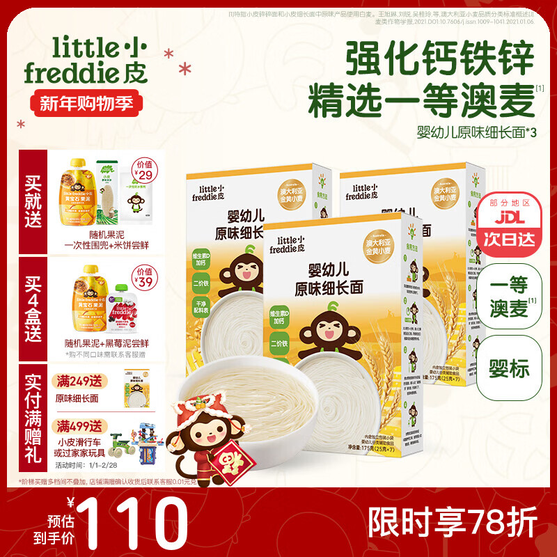 小皮(Little Freddie)婴儿宝宝面条婴幼儿碎碎面蝴蝶面 营养细面儿童面条含钙铁锌辅食 【7月+细长面】澳麦原味面3盒